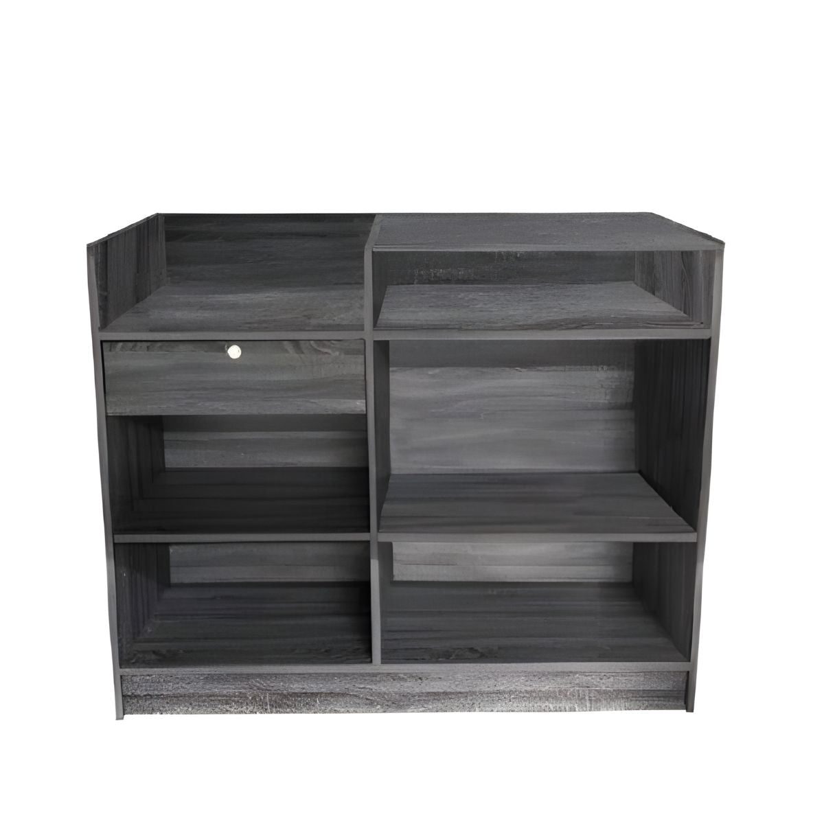 Introducing our Cash Wray Register Counter in Rustic Gray, a versatile and well-designed solution for your checkout area. This counter measures 48"L x 18"W x 38"H, providing a spacious and organized space for transactions. The counter features a register well with a hole for wires, ensuring a neat appearance. The pull-out drawer with a lock and keys offers secure storage, and two adjustable shelves allow for customizable display options. With five storage spaces, this counter combines functionality with a stylish rustic gray finish. Elevate your retail space with this efficient Cash Wray Register Counter, available at Wholesale Store Fixture.